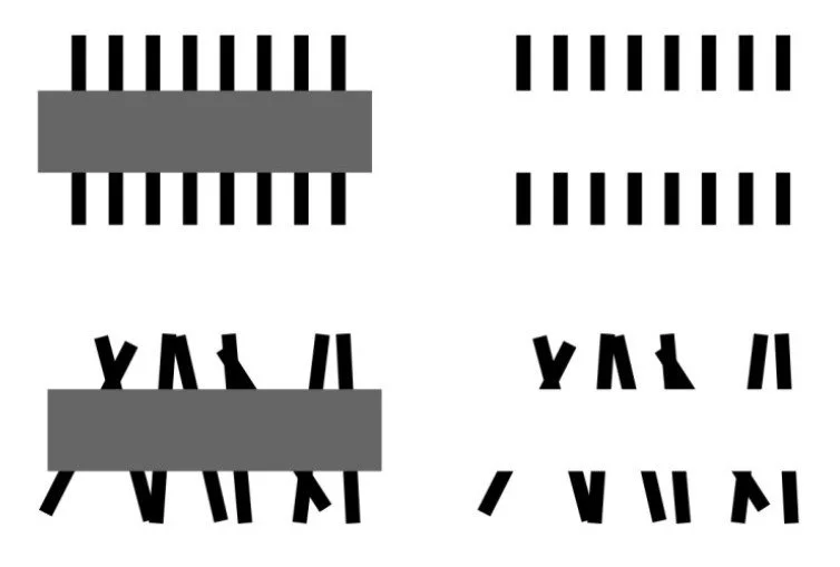 Once again, local edge geometry helps fill in gaps in the visual input. In this piece, the effect of parallelism is shown, where the alignment of edges weakens the strength of the filled-in edges.