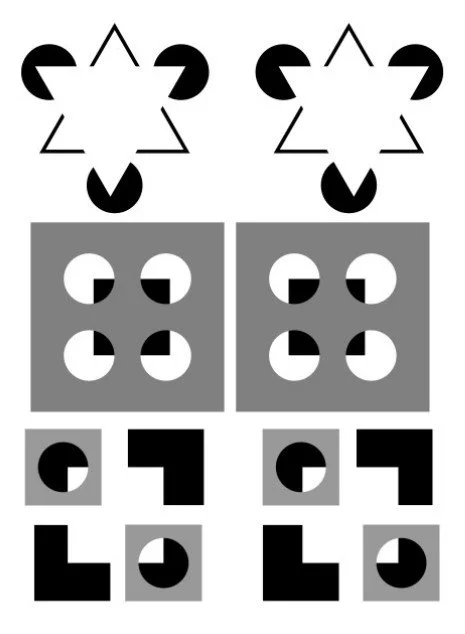 This piece showcases 'illusory edges'—edges that seem to lie in front of other elements in the scene, despite the absence of any actual contrast. The visual system relies on edge geometry to perceptually 'fill in' these edges, bridging gaps in the information received by the eyes.